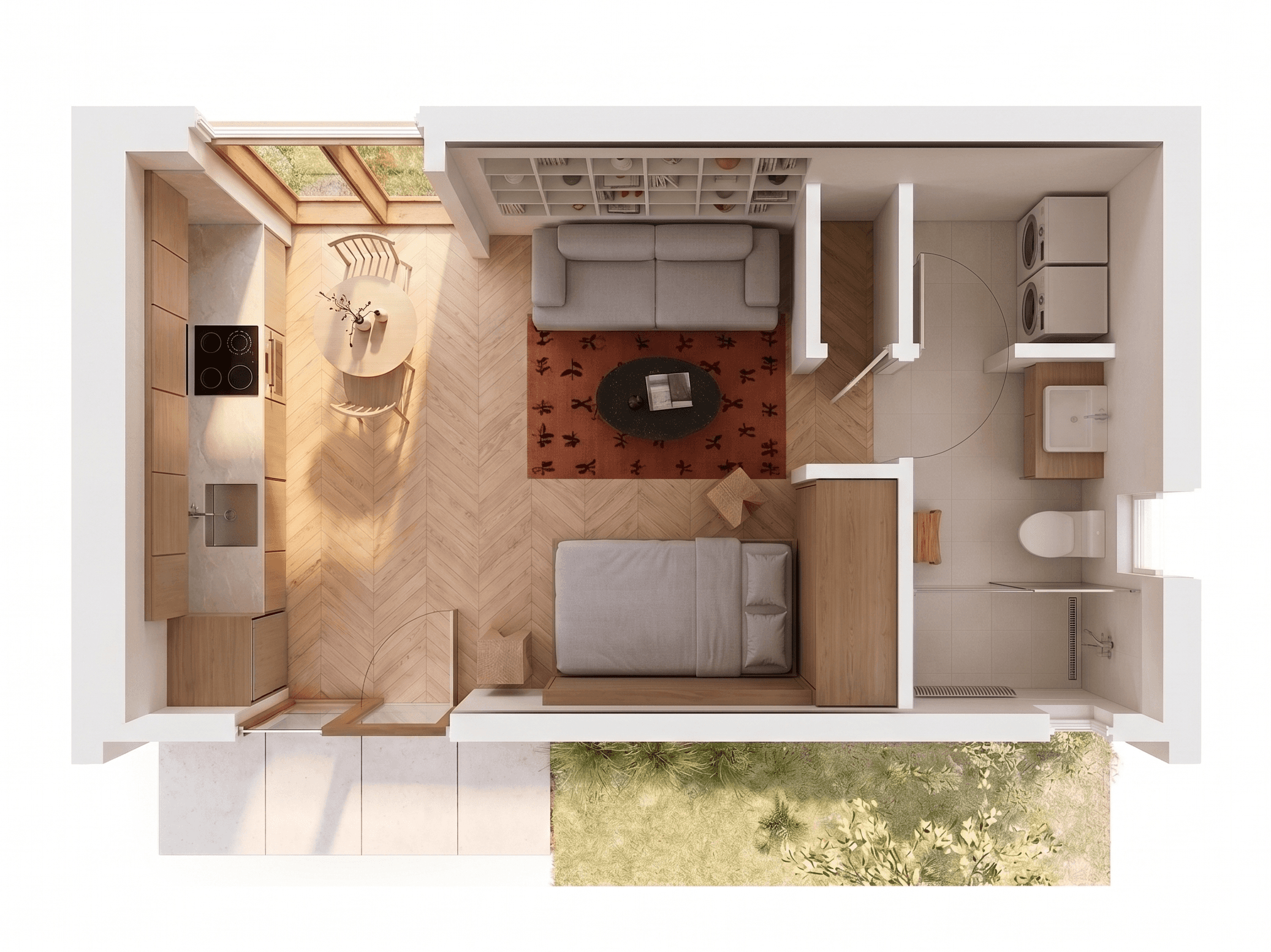 The built-in Murphy bed folds up into a wall cabinet, giving you the full floor area back during the day. Pull it down at night and you have a real bed, not a sofa cushion. Zero compromise.