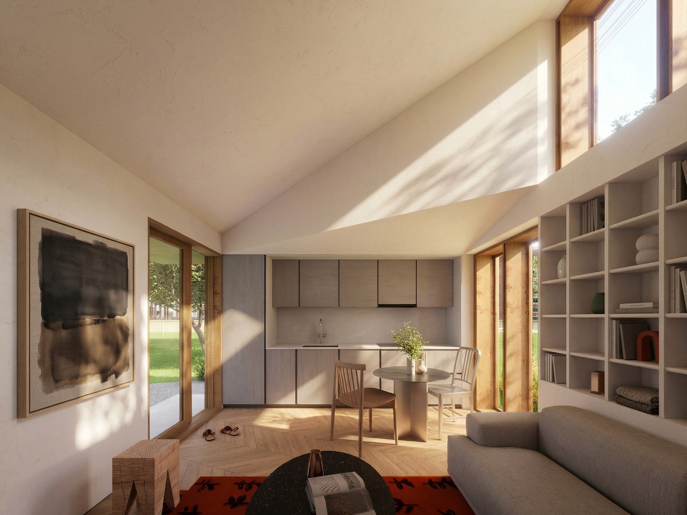 A pitched roofline creates a 13.5-foot ceiling with high clerestory windows that flood the interior with natural light. The space feels open and airy, not like a small building.
