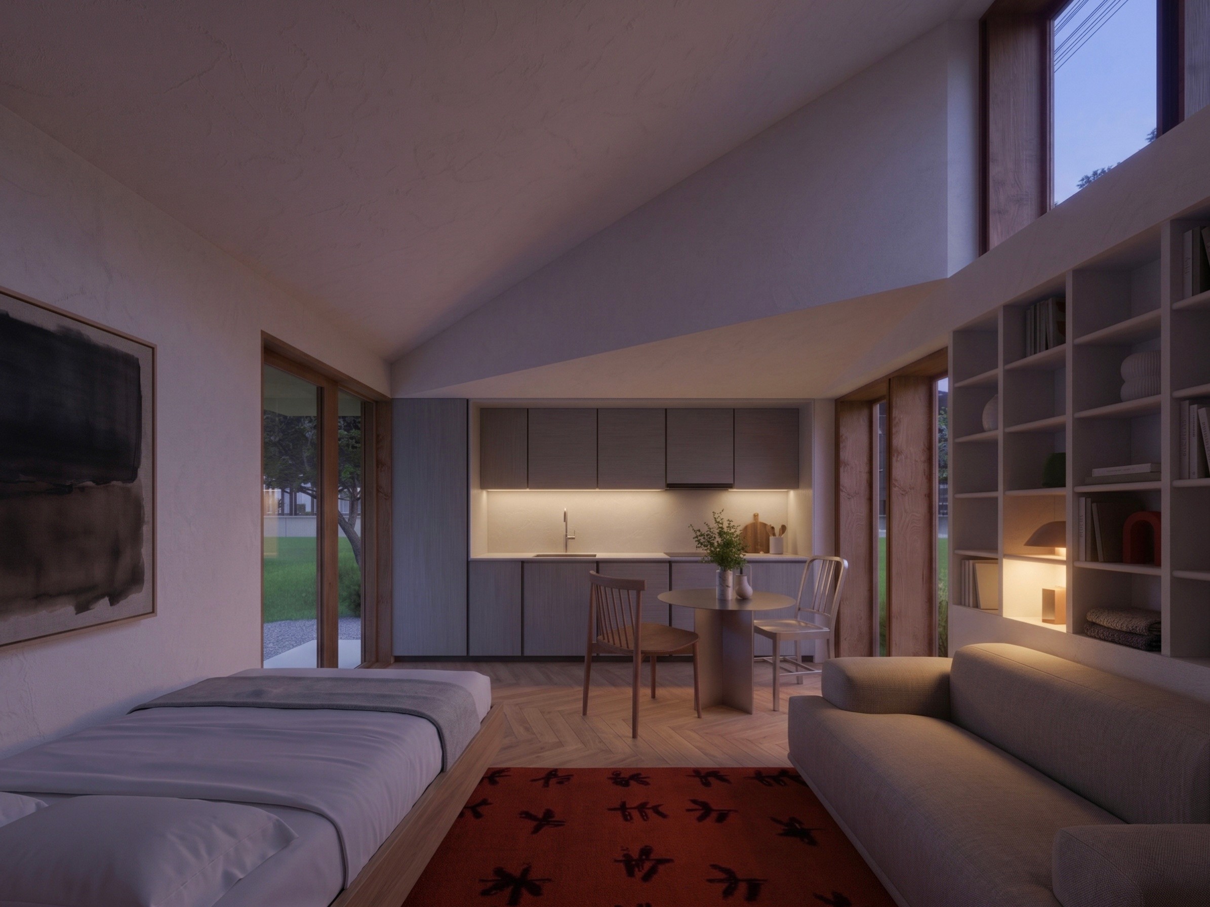 These renderings show a few ways the same structure can look and feel. During Haven's design process, you choose the exterior cladding, roofing, window frames, entry door, interior flooring, cabinetry, countertops, fixtures, and colors. The pre-approved plan is the bones. The rest is yours.